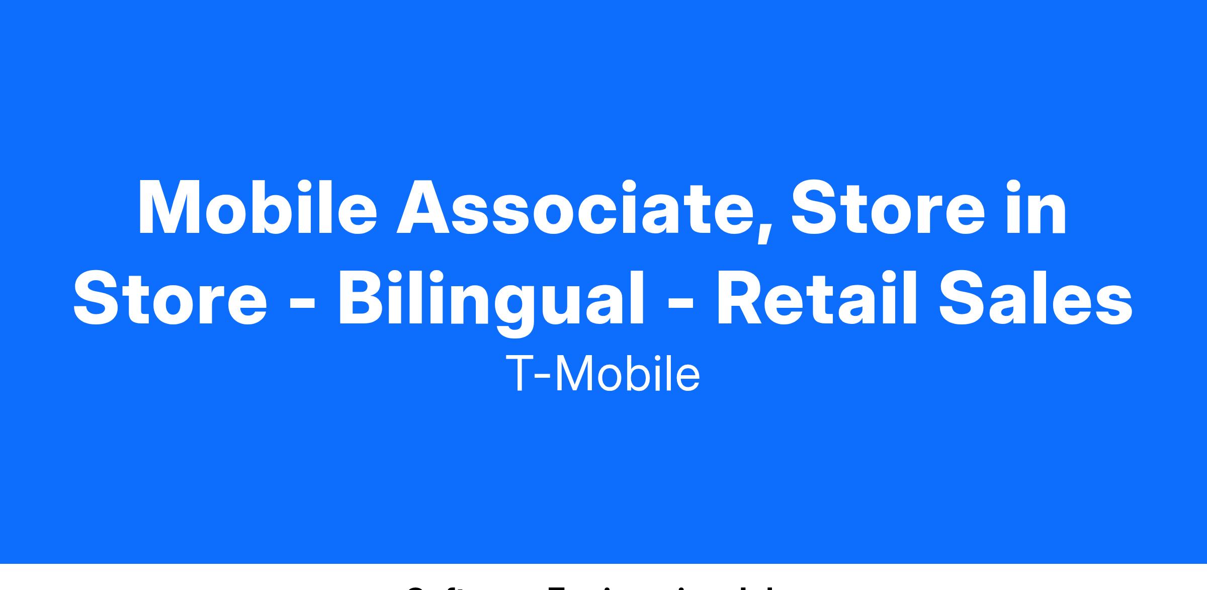 Mobile Associates, Store-in-Store are an integral part of the Retail Team responsible for bringing the T-Mobile brand to life within National Sales partner locations, where active customer engagement is crucial for success. They're ambassadors who create energy and excitement around our products and services. They are obsessed with the connected world and thrive in a high-traffic environment, where technology innovations, customer needs and the Retail experience are continuously evolving. Mobile Associates excel at building and deepening relationships with customers through meaningful interactions. They are skilled at identifying customer needs and are passionate about educating, demonstrating, and recommending solutions. Mobile Associate SiS, exceed their performance targets Doing it the Right Way, by excelling in sales, providing exceptional customer experiences, and meeting quality of sale metrics.