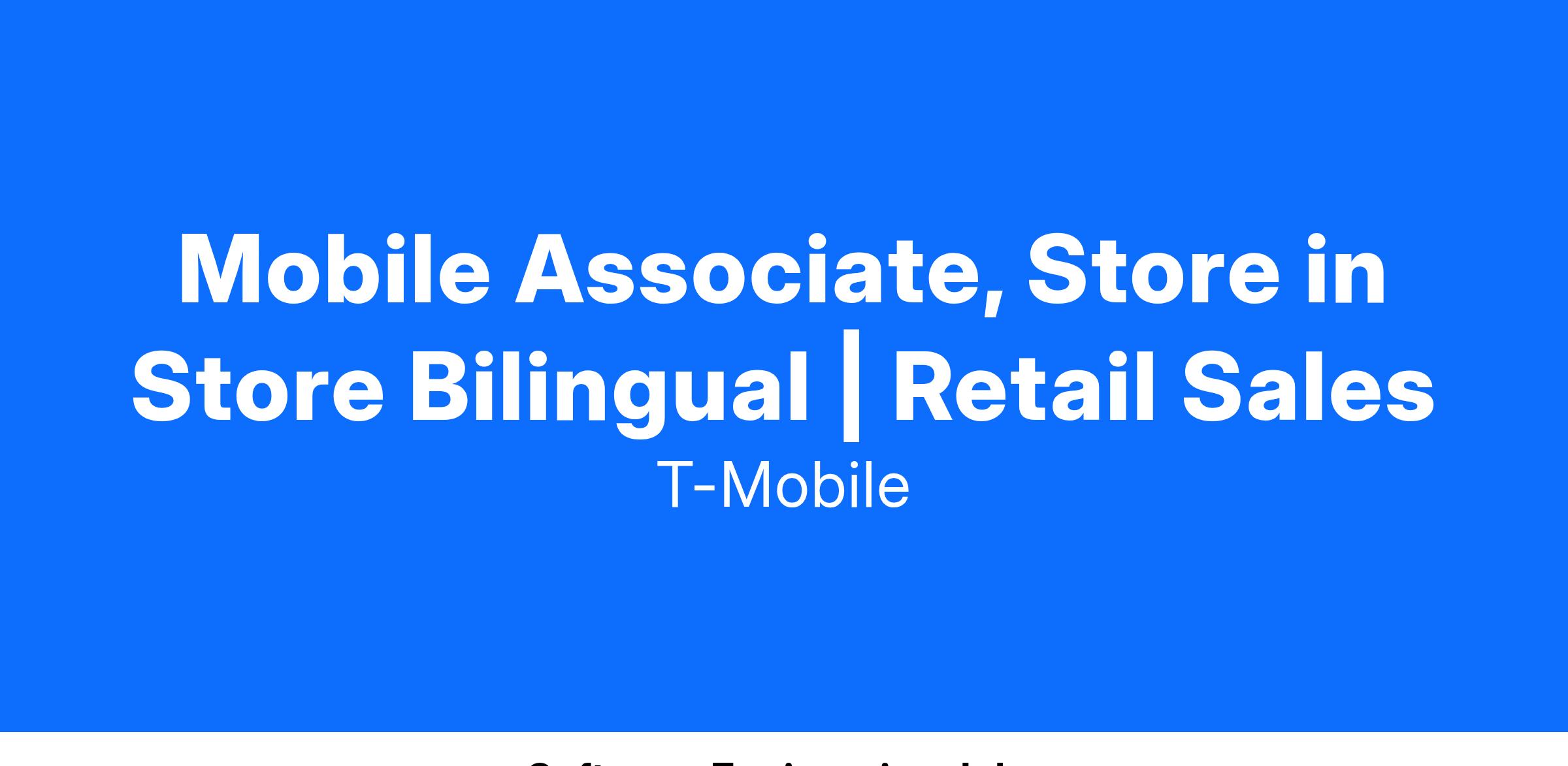 Mobile Associates, Store-in-Store are an integral part of the Retail Team responsible for bringing the T-Mobile brand to life within National Sales partner locations, where active customer engagement is crucial for success. They're ambassadors who create energy and excitement around our products and services. They are obsessed with the connected world and thrive in a high-traffic environment, where technology innovations, customer needs and the Retail experience are continuously evolving. Mobile Associates excel at building and deepening relationships with customers through meaningful interactions. They are skilled at identifying customer needs and are passionate about educating, demonstrating, and recommending solutions. Mobile Associate SiS, exceed their performance targets Doing it the Right Way, by excelling in sales, providing exceptional customer experiences, and meeting quality of sale metrics.