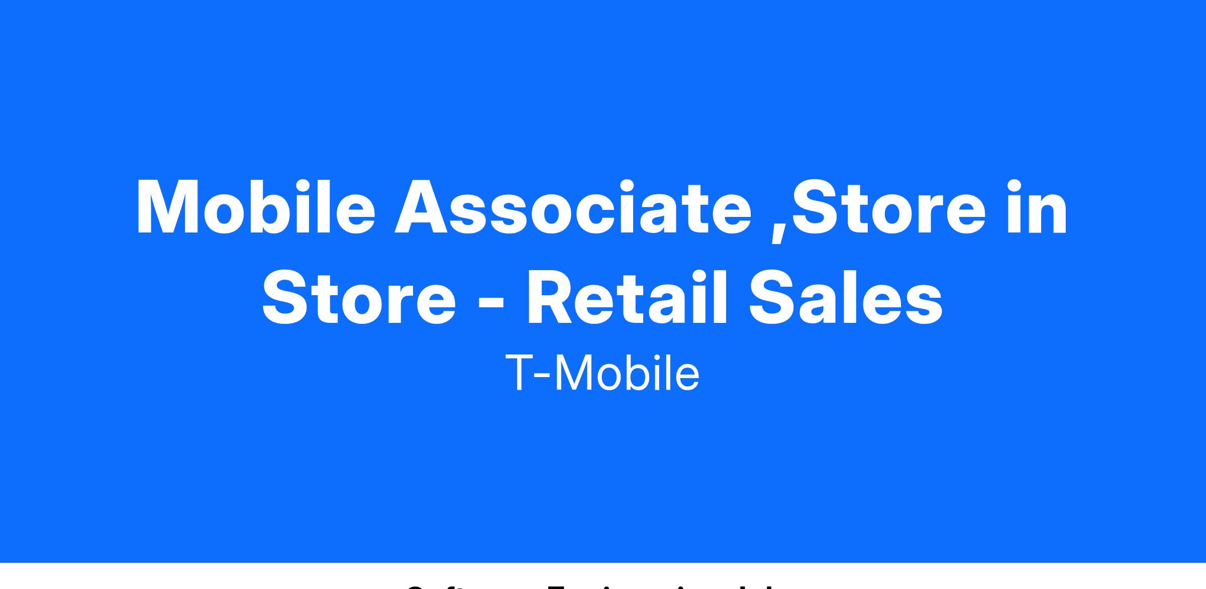 Mobile Associates, Store-in-Store are an integral part of the Retail Team responsible for bringing the T-Mobile brand to life within National Sales partner locations, where active customer engagement is crucial for success. They're ambassadors who create energy and excitement around our products and services. They are obsessed with the connected world and thrive in a high-traffic environment, where technology innovations, customer needs and the Retail experience are continuously evolving. Mobile Associates excel at building and deepening relationships with customers through meaningful interactions. They are skilled at identifying customer needs and are passionate about educating, demonstrating, and recommending solutions. Mobile Associate SiS, exceed their performance targets Doing it the Right Way, by excelling in sales, providing exceptional customer experiences, and meeting quality of sale metrics.