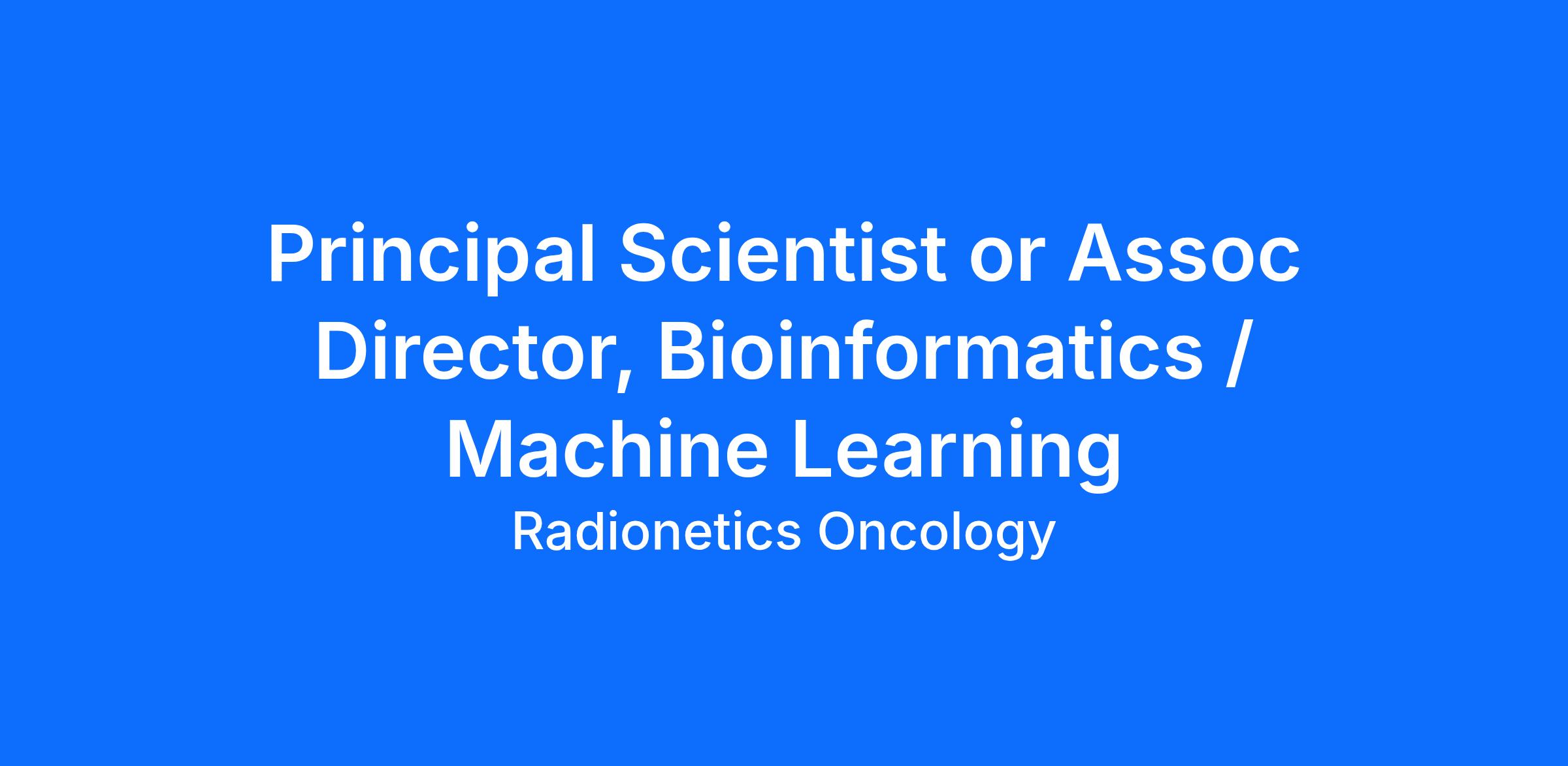 Position summary We are seeking a highly experienced Principal Scientist/Associate Director (Princ Sci/Assoc Dir) to lead the application of machine learning and AI to large‑scale proteomics data in support of radiopharmaceutical target validation, prioritization, and patient selection strategies. This role will also have scientific ownership of the internal sample and proteomics data infrastructure, ensuring data quality, consistency, and long‑term usability across discovery and clinical programs. The Princ Sci/Assoc Dir will operate at the intersection of computational biology, proteomics, and translational oncology, transforming complex datasets into actionable insights that directly impact both preclinical and clinical decision‑making.