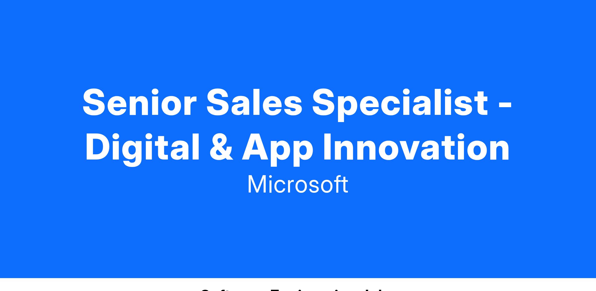 Microsoft is currently seeking Senior Sales Specialists - Digital & App Innovation to join our teams across various business groups and customer segments, including enterprise, regulated industries, and partner services organizations. This is a nationwide hiring effort, and by applying, you will be considered for multiple opportunities across the United States, not limited to the role's posted location. The position offers flexibility, allowing you to work up to 50% remotely, with travel requirements varying based on the specific role.