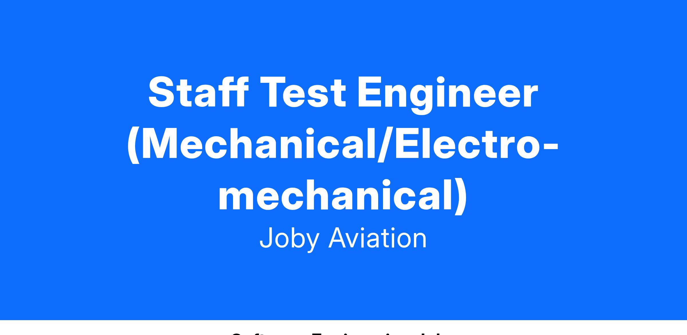 Joby Aviation seeks a highly organized, passionate individual to join our testing team. As part of this team, you will perform structural, environmental, and functional tests of flight-critical components and subsystems for VTOL electric aircraft. The data collected during these tests will inform the companyβs hardware design efforts and pave the way to production-ready hardware. The Joby Aviation team is made up of extremely talented, hardworking, proactive, and hands-on individuals, operating in a very fast-paced and rewarding environment. We are looking to expand this team with like-minded individuals looking to make a mark in the transportation industry.