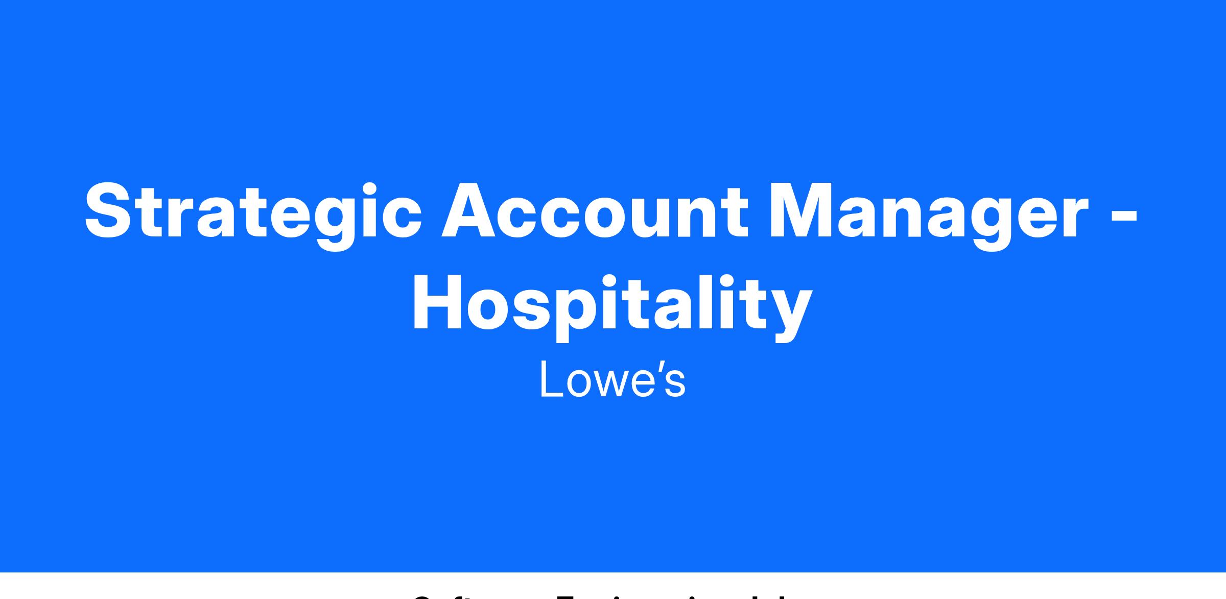 The Strategic Account Manager – hospitality sales is responsible for maintaining and expanding relationships with strategically important large customers across all focus segments of Lowe's. This person must build and maintain long-term, mutually beneficial partnerships with key personnel in assigned strategic accounts. S/he will be the main point of contact for all national account matters and is required to understand the account's needs and collaborate with other internal functions to ensure that accounts succeed in achieving their business objectives. This person is also expected to bring in new business from existing national accounts by cross selling and/or upselling products/service offerings as well as bring new customers to the Lowe's organization.