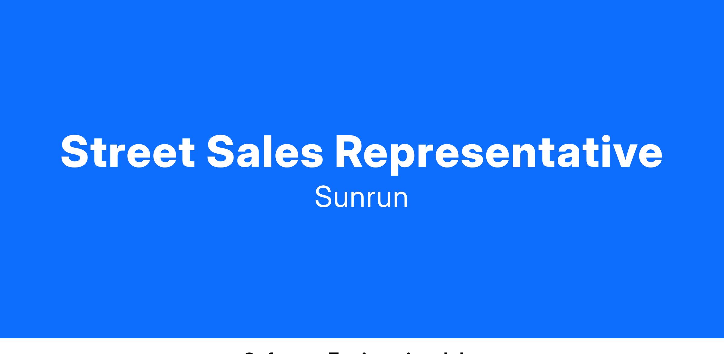 As a Solar Sales Specialist on the Street team, you will engage with potential customers, educate them on the benefits of solar power, and guide them through the sales process. This position offers uncapped commissions, comprehensive training, and significant opportunities for career growth within a dynamic and rapidly expanding industry. Are you an ambitious, self-motivated individual with a passion for renewable energy and a flair for sales? This is your chance to play a key role with Sunrun, America’s #1 home solar and battery provider in accelerating the transition to clean, sustainable energy while enjoying the freedom of a flexible schedule and the opportunity to earn uncapped income.